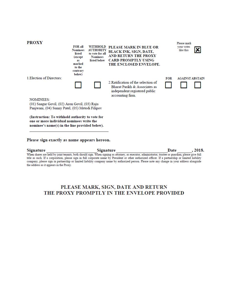 “FOR” the election of each of the five nominees, Saagar Govil, Aron Govil, Raju Panjwani, Sunny Patel and Metodi Filipov, proposed by the Board of Directors to serve as directors, each for a term of one year (Proposal 1);