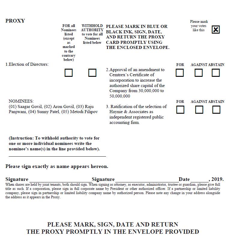 | 2. | To approve an amendment to Cemtrex’s Certificate of Incorporation to increase the number of authorized shares of Cemtrex Common Stock from 30,000,000 shares to 50,000,000 shares; and | |