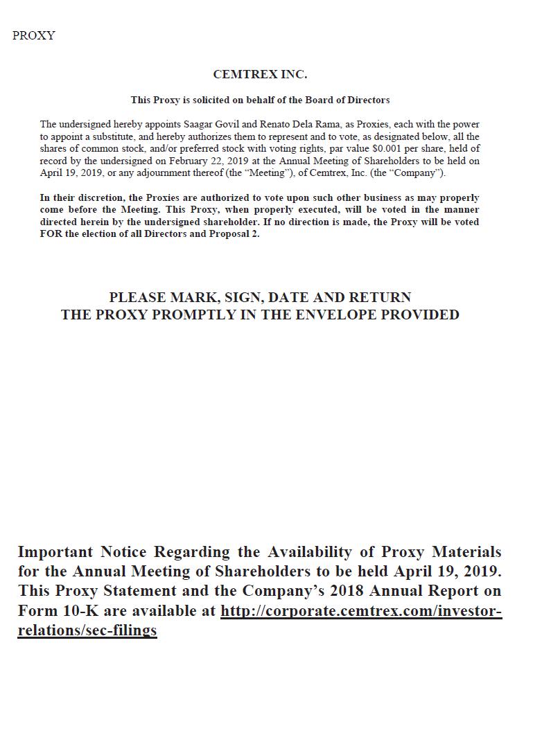 The Annual Meeting of Shareholders (the “Annual Meeting”) of CEMTREX INC. (the “Company”) will be held on Friday, April 19, 2019, at The Courtyard by Marriott Long Island City, 29-15 Queens Plaza North, Long Island City, NY 11101, at 9:30 a.m. for the purposes set forth in the accompanying Notice of Annual Meeting of Shareholders. The enclosed Proxy is solicited by and on behalf of the Board of Directors of the Company (“Board of Directors” or “Board”) for use at the Annual Meeting to be held on Friday, April 19, 2018, and at any adjournments of such Meeting. The approximate date on which this Proxy Statement and the enclosed Proxy are being first mailed to shareholders is March 22, 2018.