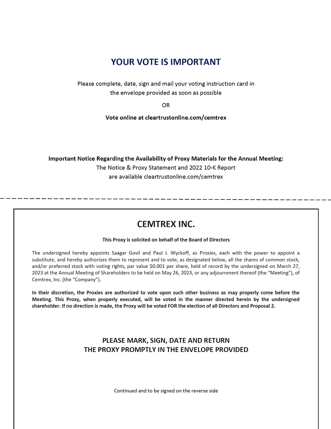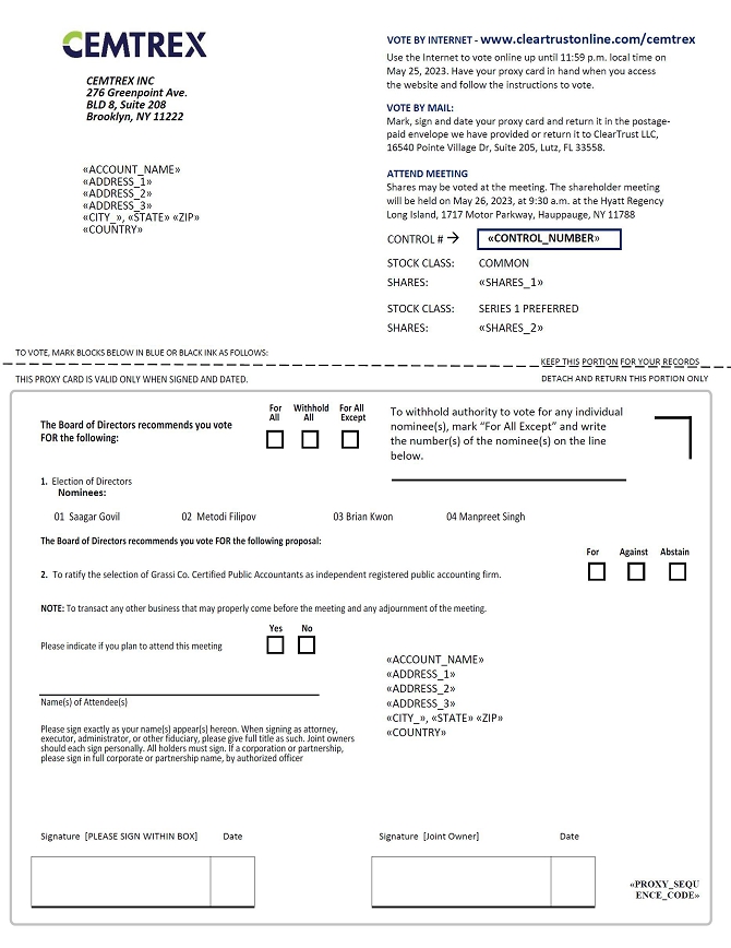 NOTICE IS HEREBY GIVEN that the Annual Meeting of Shareholders (the “Annual Meeting”) of CEMTREX, INC., a Delaware corporation (the “Company”), will be held at the Hyatt Regency Long Island, 1717 Motor Parkway, Hauppauge, NY 11788, on Friday May 26, 2023, at 9:30 a.m. Eastern Daylight Time, or at any adjournment thereof, for the following purposes: