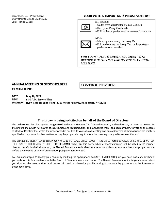 NOTICE IS HEREBY GIVEN that the Annual Meeting of Shareholders (the “Annual Meeting”) of CEMTREX INC., a Delaware corporation (the “Company”), will be held at the Hyatt Regency Long Island, 1717 Motor Parkway, Hauppauge, NY 11788, on Thursday May 16, 2024, at 9:30 a.m. Eastern Daylight Time, or at any adjournment thereof, for the following purposes: