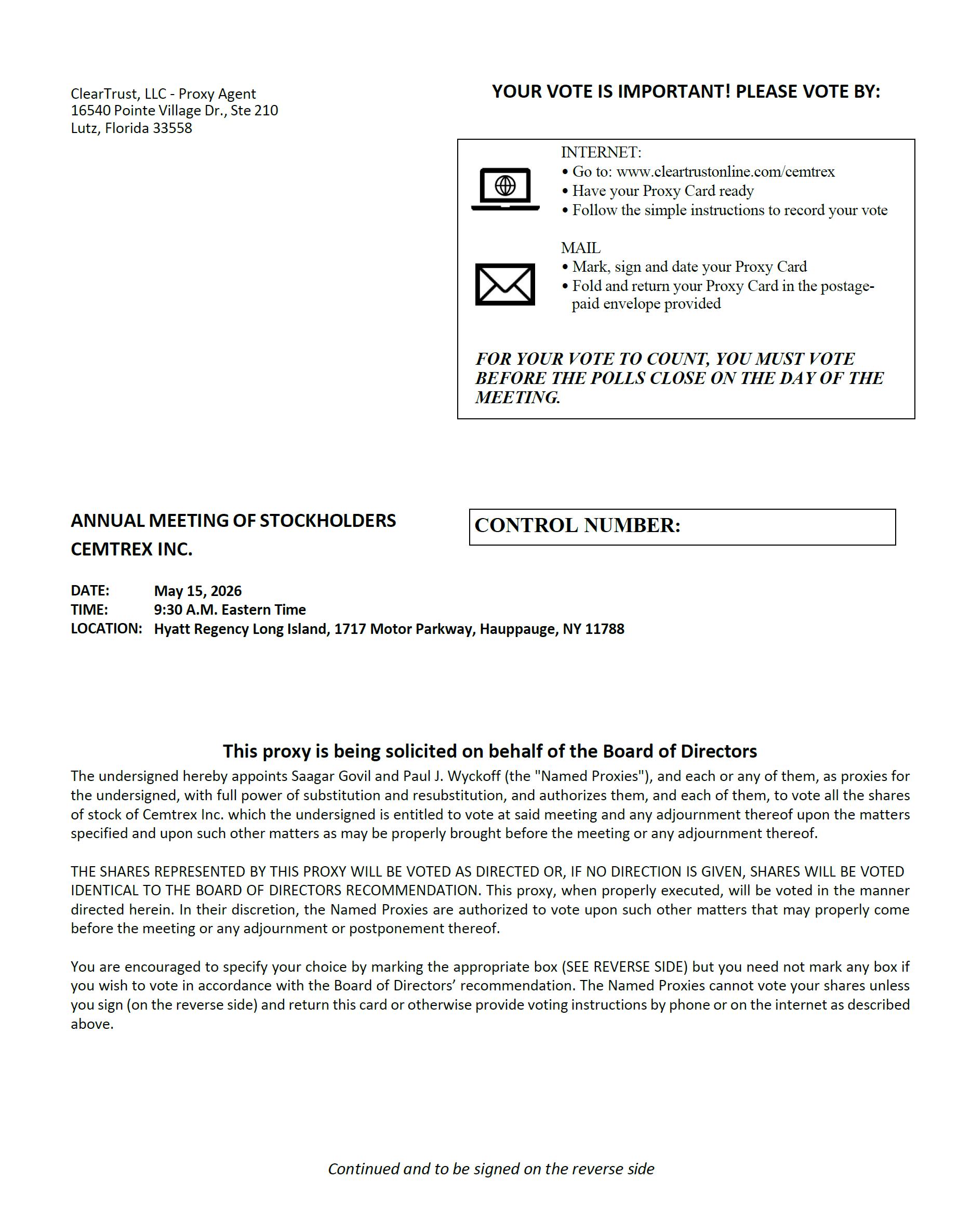 NOTICE IS HEREBY GIVEN that the Annual Meeting of Shareholders (the “Annual Meeting”) of CEMTREX INC., a Delaware corporation (the “Company”), will be held at the Hyatt Regency Long Island, 1717 Motor Parkway, Hauppauge, NY 11788, on Friday May 15, 2026, at 9:30 a.m. Eastern Daylight Time, or at any adjournment thereof, for the following purposes: