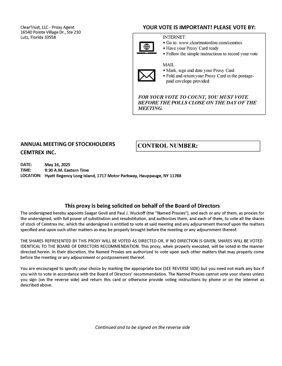 NOTICE IS HEREBY GIVEN that the Annual Meeting of Shareholders (the “Annual Meeting”) of CEMTREX INC., a Delaware corporation (the “Company”), will be held at the Hyatt Regency Long Island, 1717 Motor Parkway, Hauppauge, NY 11788, on Friday May 16, 2025, at 9:30 a.m. Eastern Daylight Time, or at any adjournment thereof, for the following purposes:
